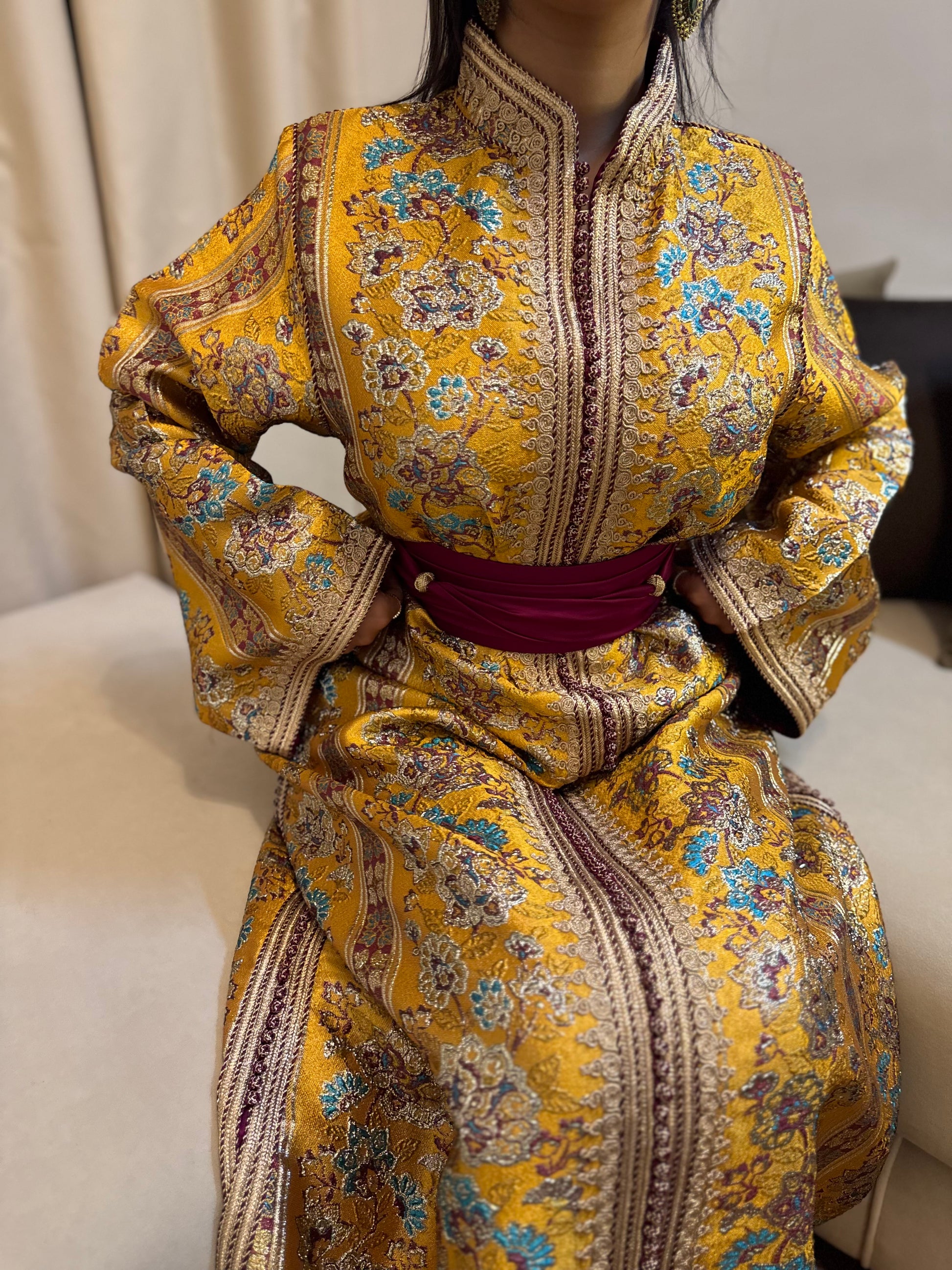 Doté d’une sfifa délicate et de finitions soignées, ce caftan allie tradition et modernité avec finesse. Une ceinture assortie en satin vient souligner la taille et apporter une touche d’élégance supplémentaire.