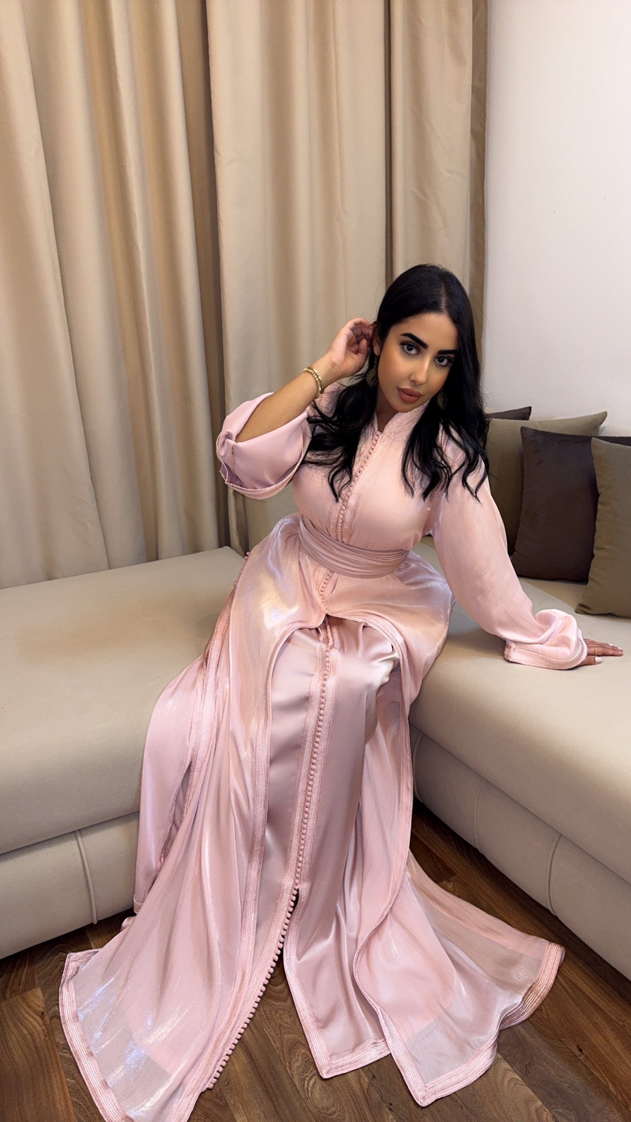Élégante et raffinée, la Takchita Candy Pink est une pièce unique composée de deux robes superposées. La robe du dessous est confectionnée en satin de soie fluide, offrant un tombé léger et gracieux, tandis que la robe du dessus est réalisée en organza, apportant une touche de luxe et de sophistication.